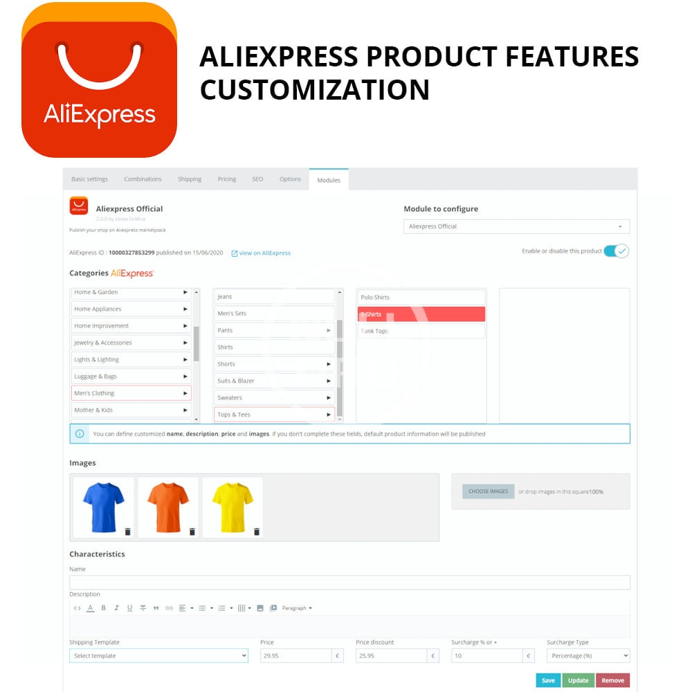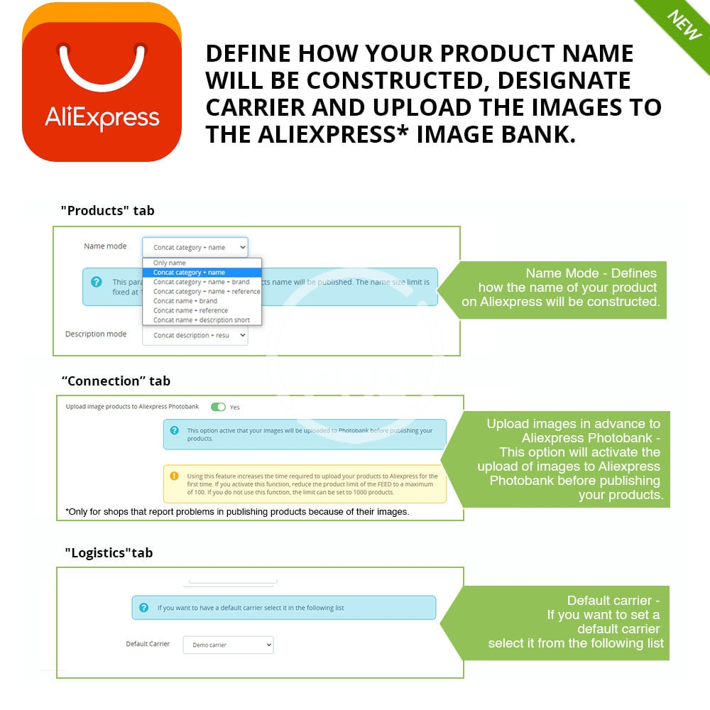 - Allows the creation of product names on Aliexpress from rules. (“Product” tab: Name Mode). For example: Name only, Category + Name, Category + Name + Brand, Category + Name + Reference, etc. – New features version 2.0.8.