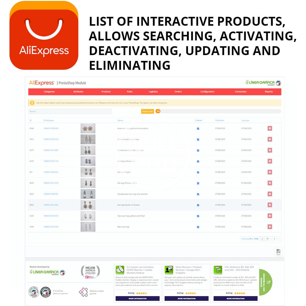 - It includes an interactive list of products, where you can search for your published products and activate, deactivate, update or delete them directly from the list.