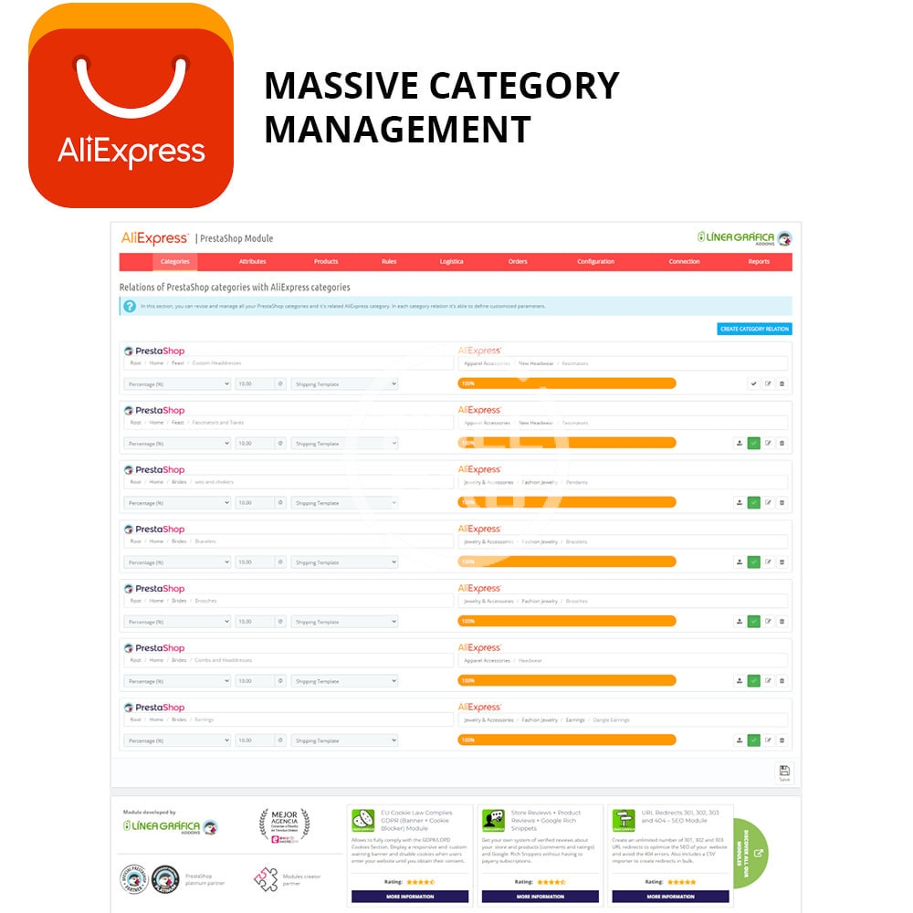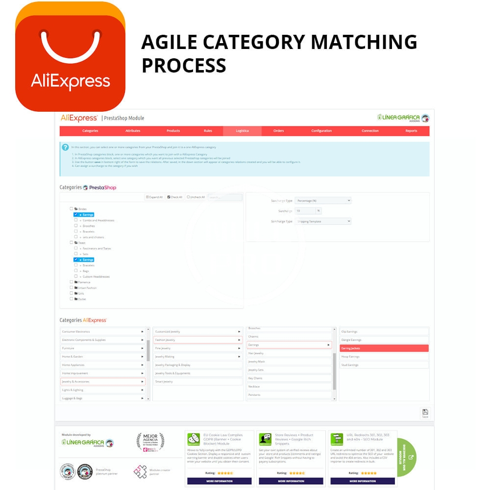 - Includes an agile category matching system. You can link multiple categories to one of AliExpress simultaneously.