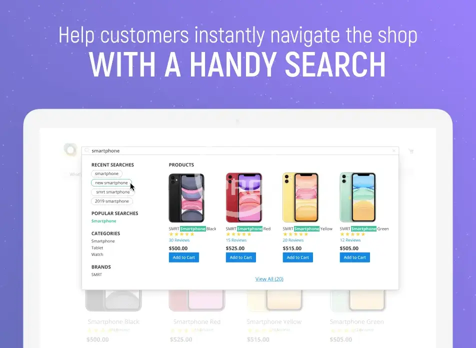 Help customers smoothly navigate through the website and quickly find desired products with Magento 2 Advanced Search. Show related, recent, and popular keywords to upsell via flexibly customizable autocomplete popup.