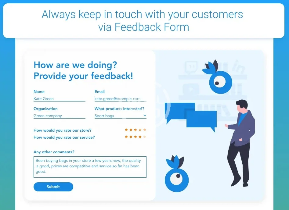 Use Magento 2 Form Builder to create web questionnaires of various types and effectively collect customer info. Enjoy a handy constructor to generate multiple questionnaires in no time and customize each to meet your needs. Extend functionality of your store with form validation feature.