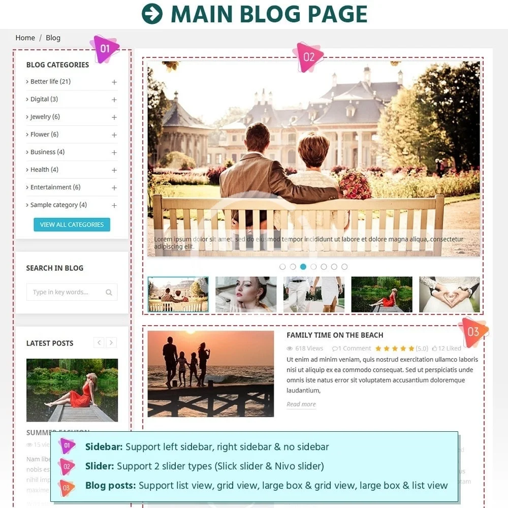 El blog viene con un slider de imágenes hermoso con efectos de animación atractivos y muchas opciones de slider útiles para elegir según tus preferencias.