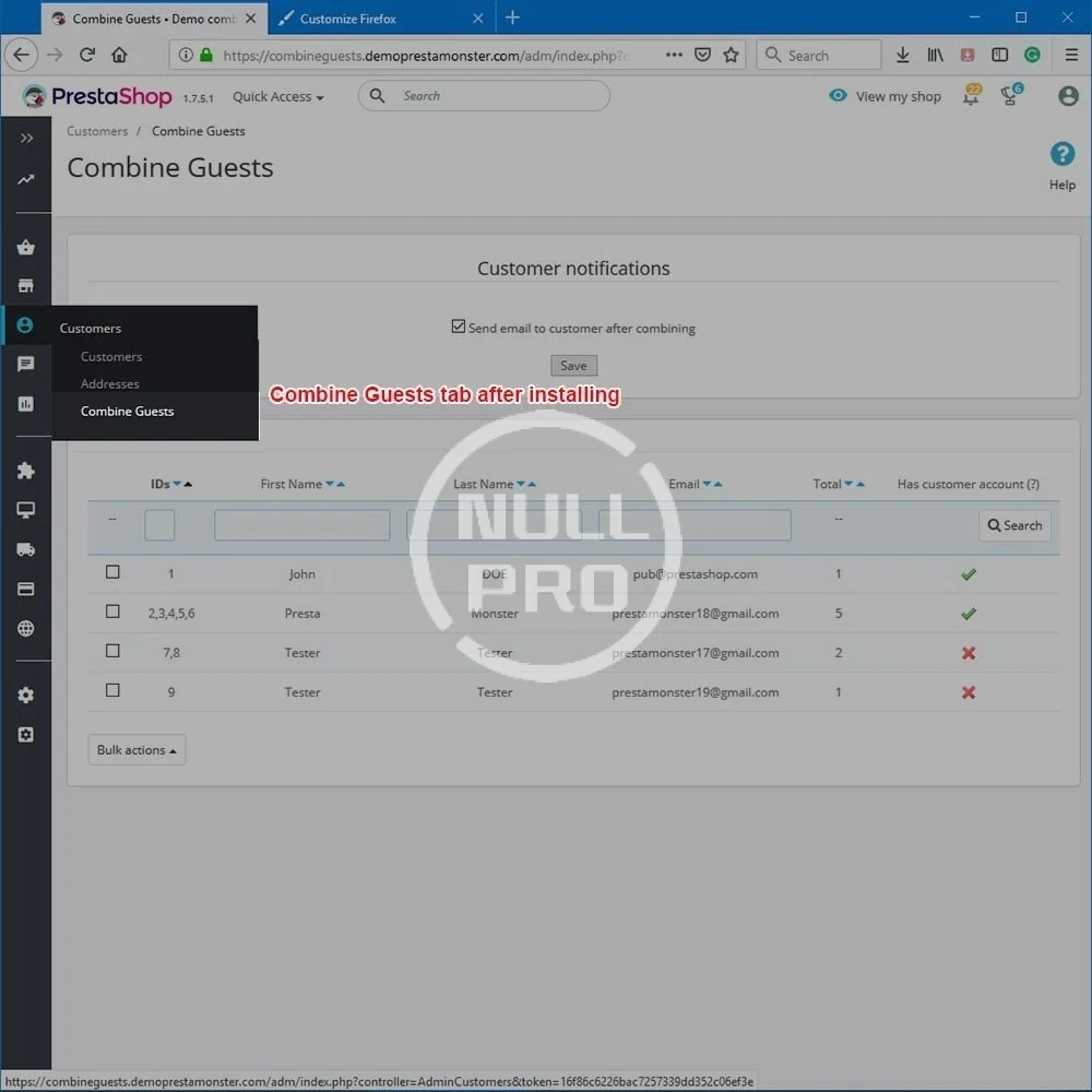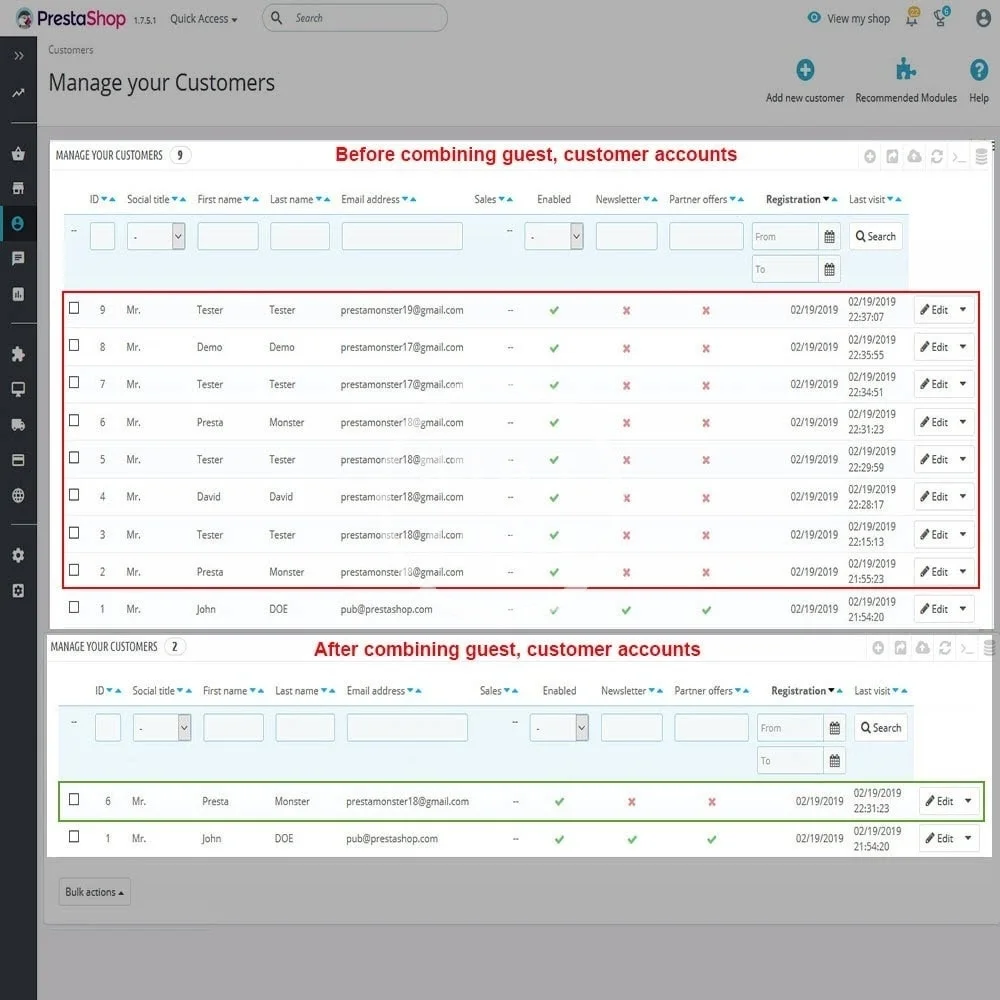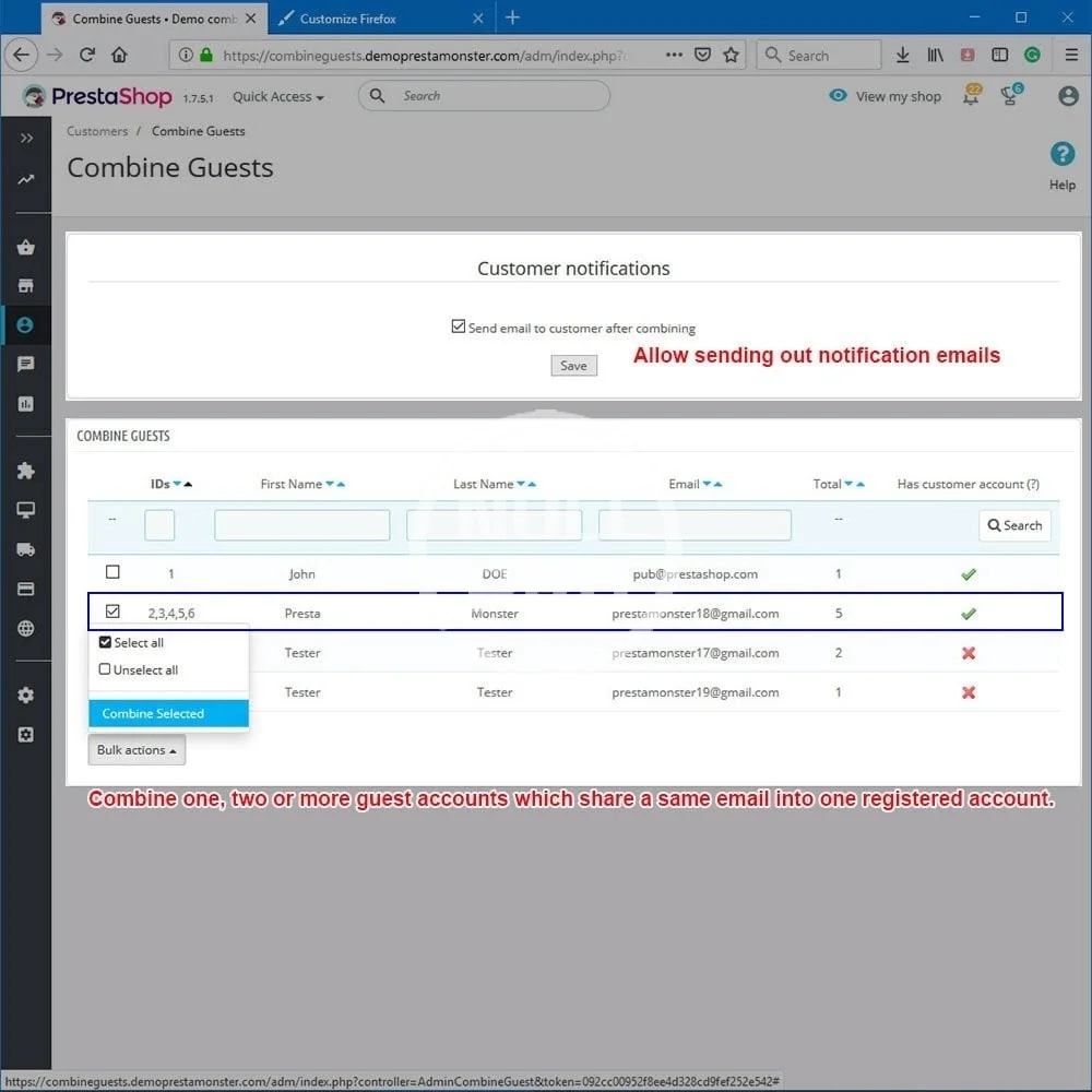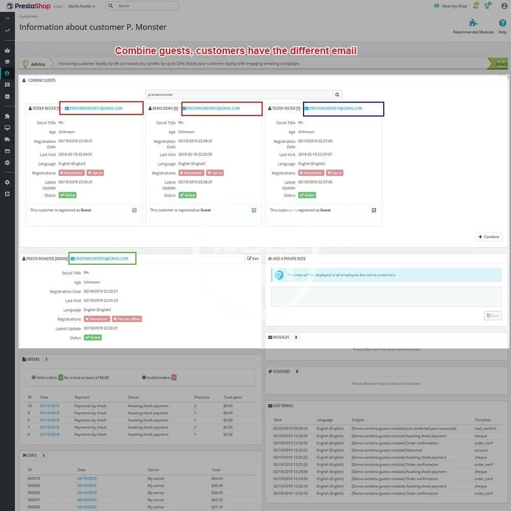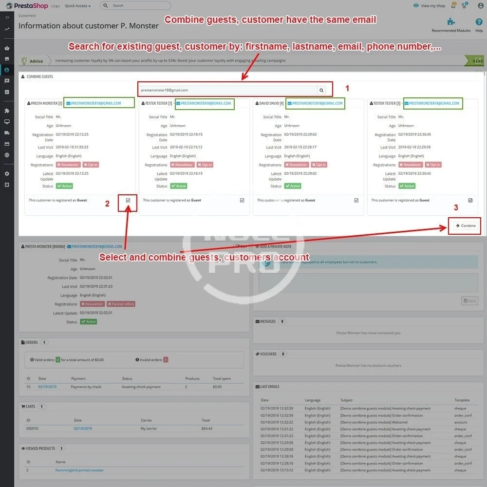Combine one, two or more guest accounts which share a same email into one registered account. Managing users & orders easily.