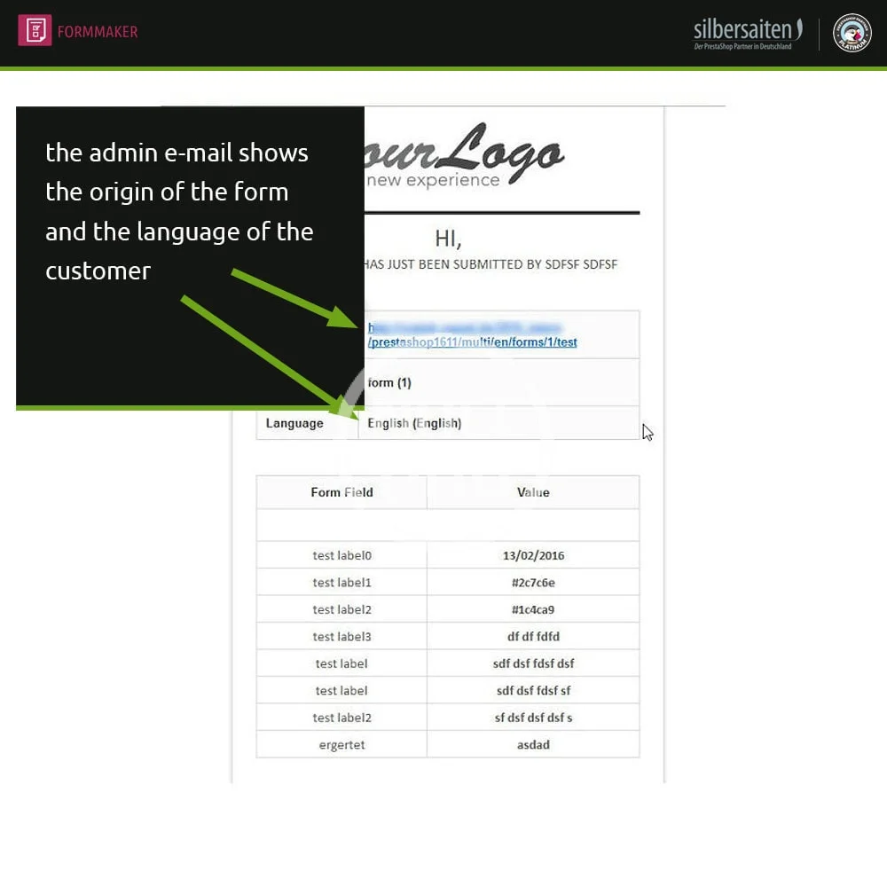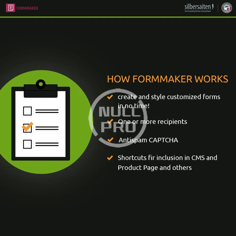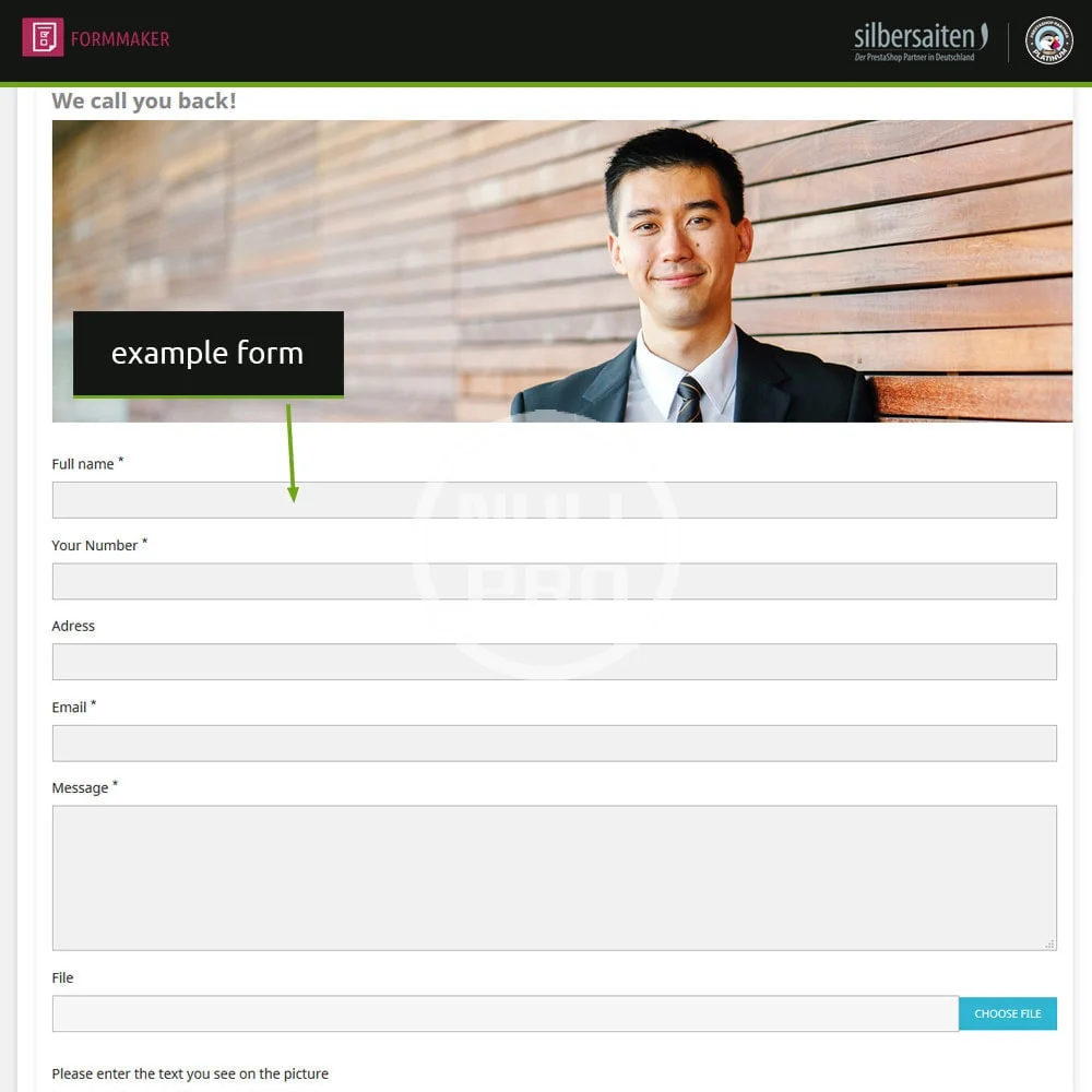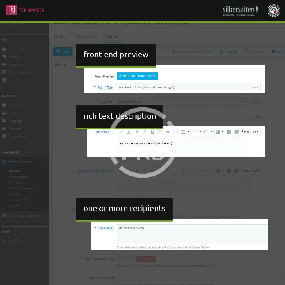 With this module you can generate universal forms without limit. These forms can operate as diverse contact pages or also be integrated into product tabs.