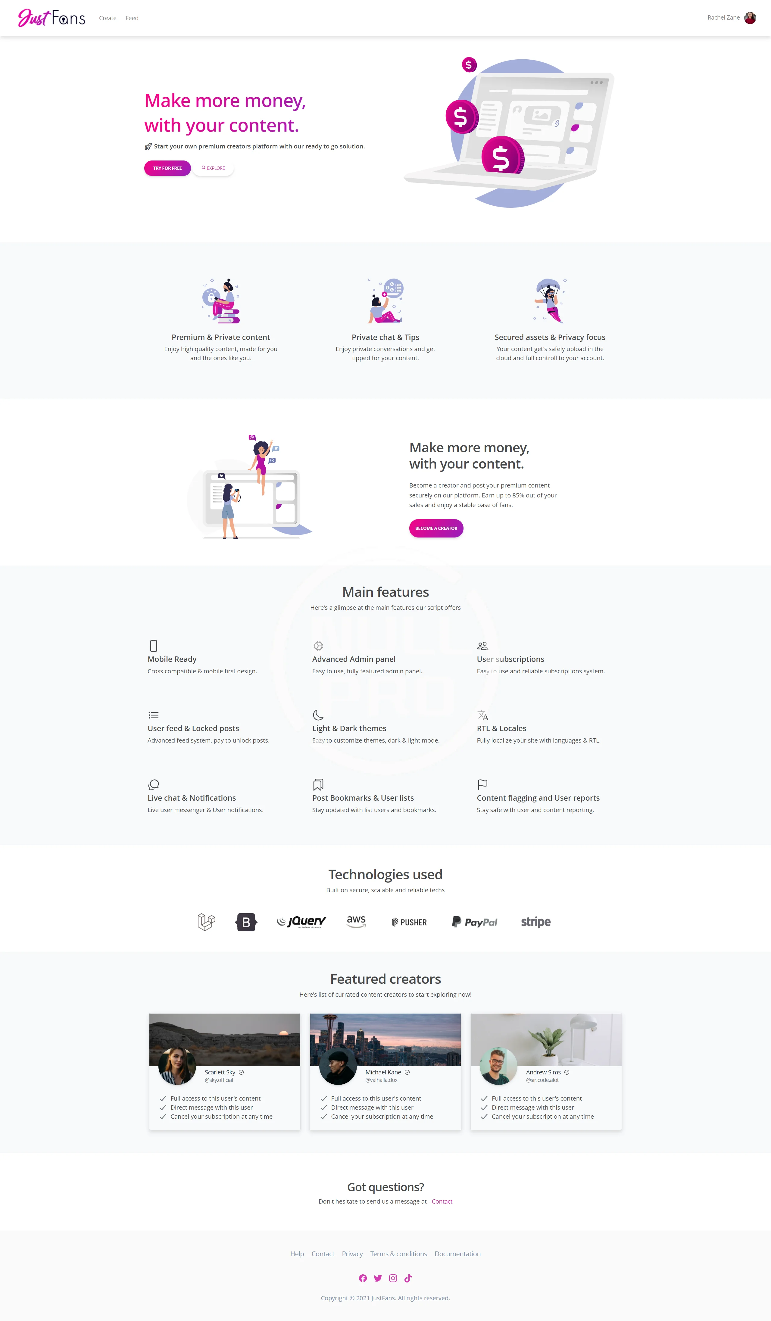JustFans – Creadores de Contenido Premium SaaS es una plataforma de PHP completamente funcional que te permite comenzar tu propio plataforma de medios sociales premium en poco tiempo.