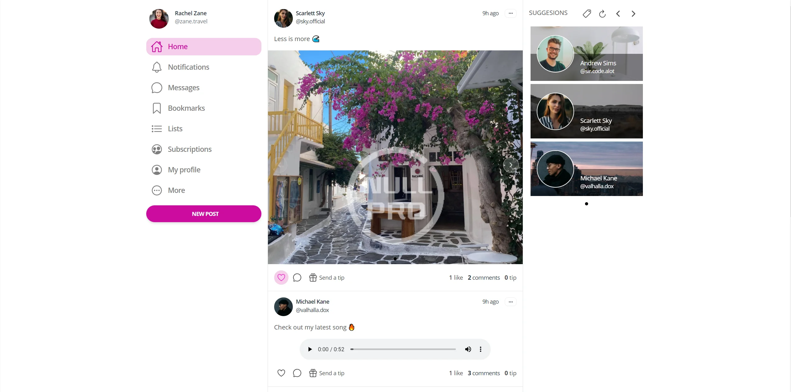 El experiencia está impulsado por un diseño móvil primero, limpio y fácil de usar, con temas de modo oscuro y claro, RTL y capacidades de localización. Permite a tus creadores vender su contenido premium a través de suscripciones mensuales, ofertas, paquetes, consejos y pagar para desbloquear publicaciones.