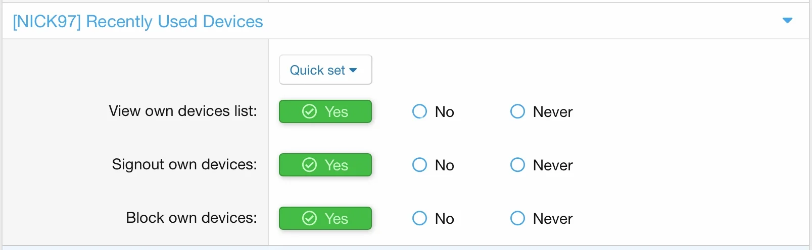 - User group permission (View own devices list, Signout own devices and Block own devices)