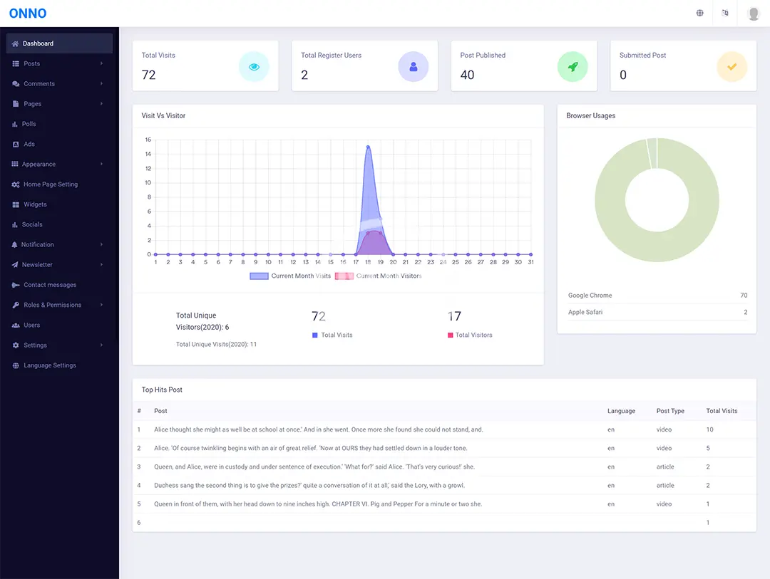 ONNO is complete News & Magazine CMS to easily start your online news & magazine platform. It has most powerful admin panel for manage article, videos, pulls, widget and many more. ONNO is build with one of the best web application framework — Laravel. Start online news and magazine site with ONNO to manage upto 100B article easily.Link: https://onno.spagreen.net/ Username: [email protected]