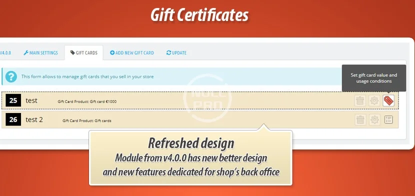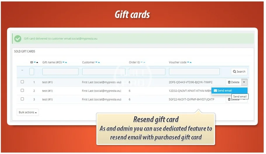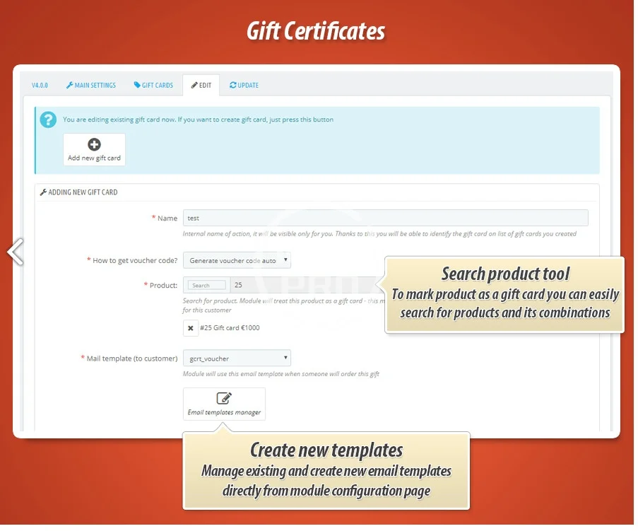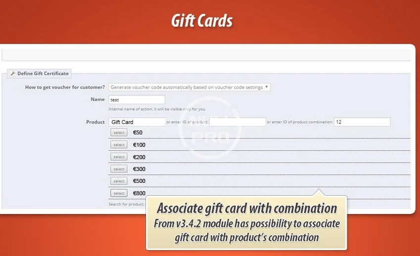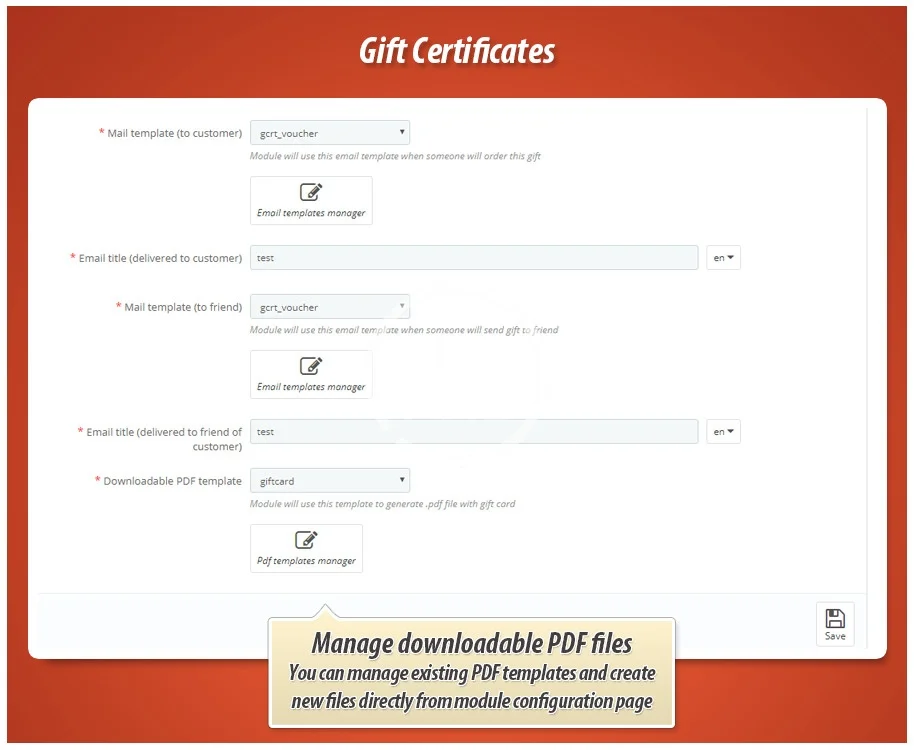 The main and most important feature of this module is a possibility to sell gift cards with fully automated voucher (gift card) generation process. Customers will automatically receive their gift certificates - right after payment or order confirmation by shop admin (you can define order statuses for which customer will receive own unique gift card).