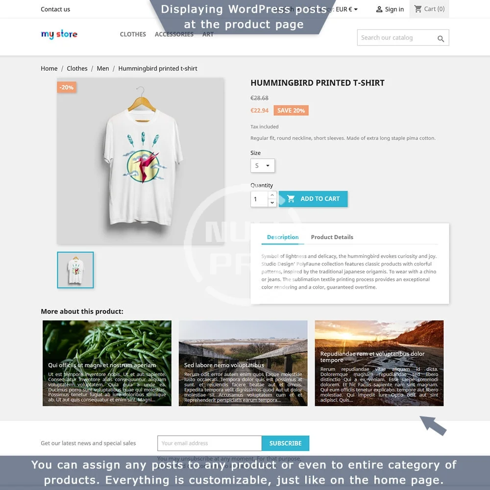 - Posts at the product page - show related articles written exactly about your products. You can select specific posts or show posts from some category, configure each product separately or show posts for a whole category of products - anything you need.