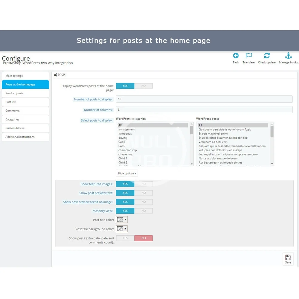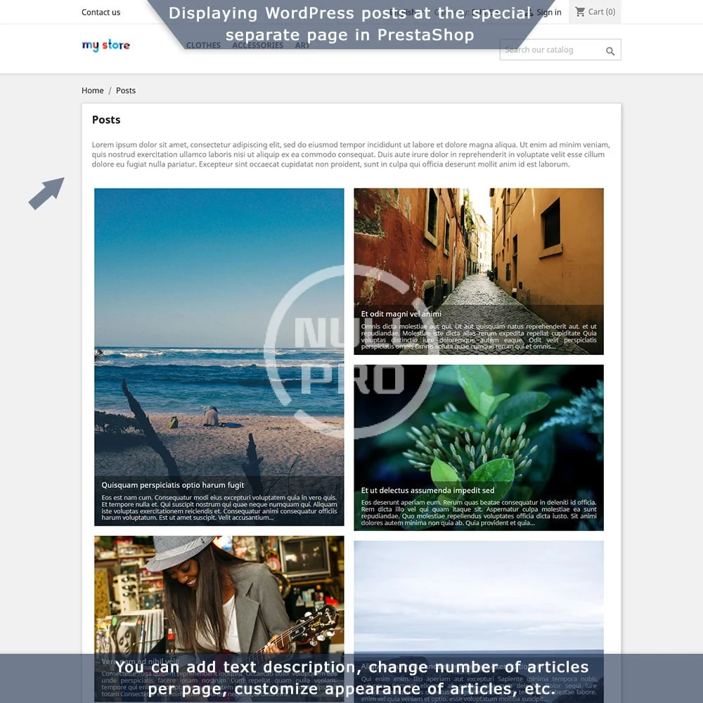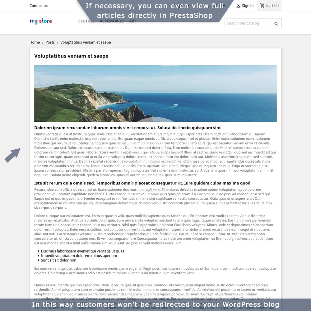 - List of all posts on a special separate page - display the full list of your posts directly in PrestaShop, with pagination, description, SEO fields, etc. If necessary you can even display full content of articles directly in PrestaShop and customers won’t be redirected to WordPress