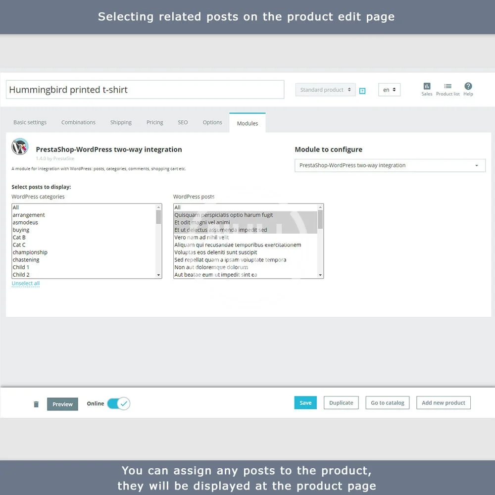 Display WordPress posts in your store and PrestaShop products in your blog.