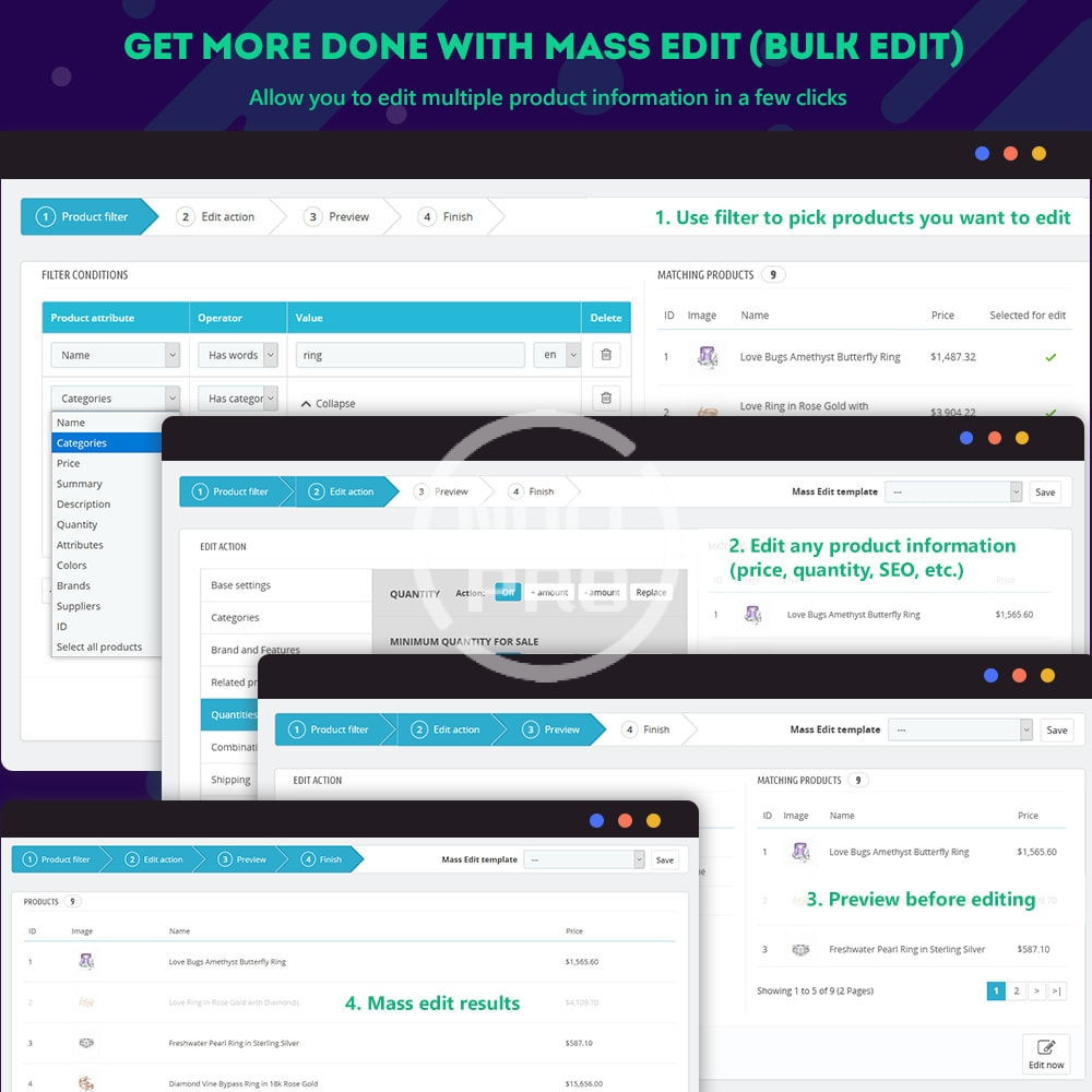 - Mass/bulk edit: mass edit any product information in a few clicks: product basic info (name, images, reference, category, etc.), quantity, pricing, SEO, shipping, other info (tags, condition, attached files, etc.). No downtime to your store during mass/bulk edit.