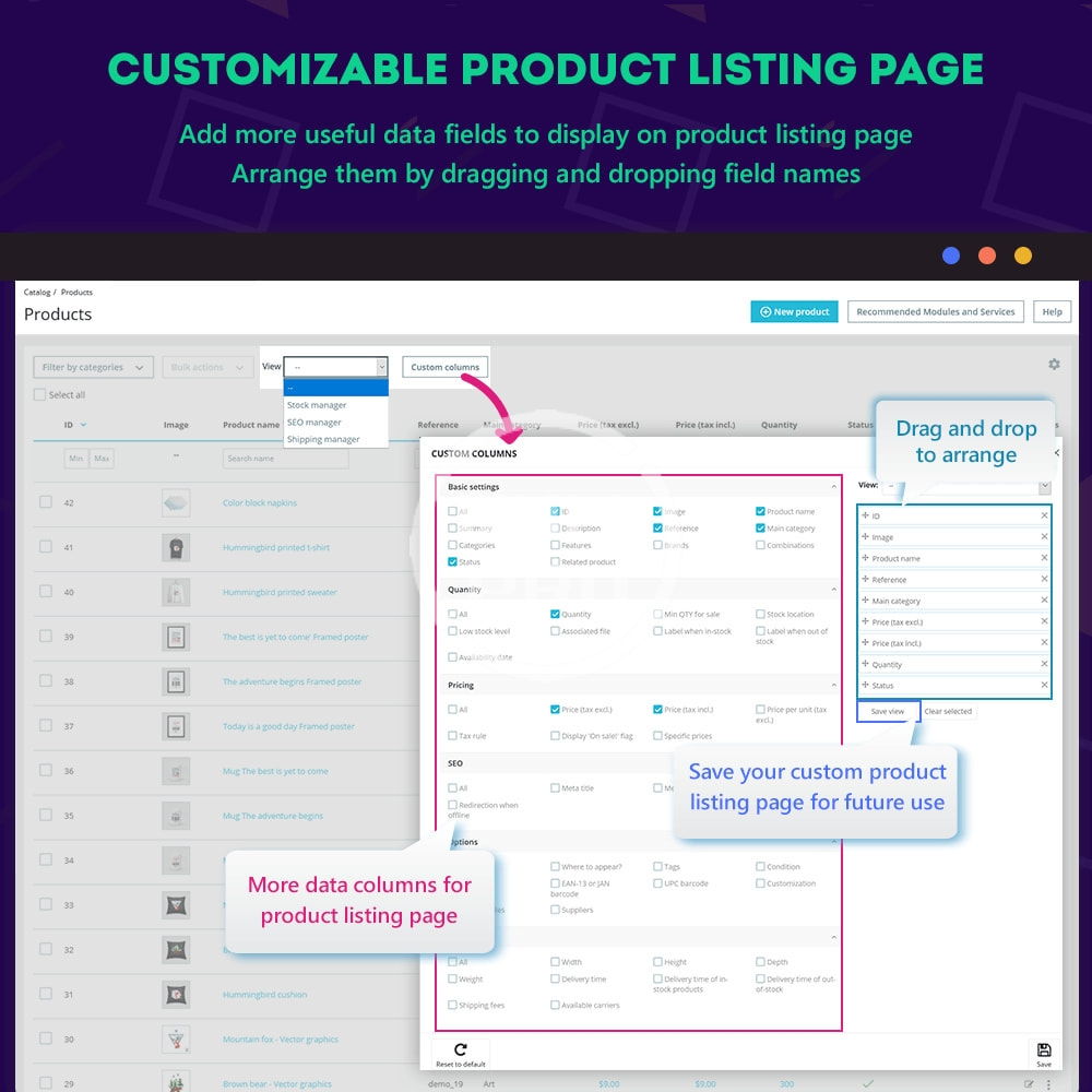 - Customizable product listing page: enable you to add more useful data fields (compared to default fields that PrestaShop offers) to display on the product listing page. You may select data fields to display and sort up data fields by dragging and dropping field names.