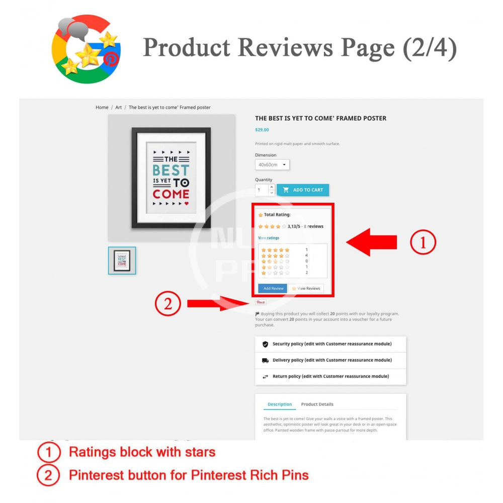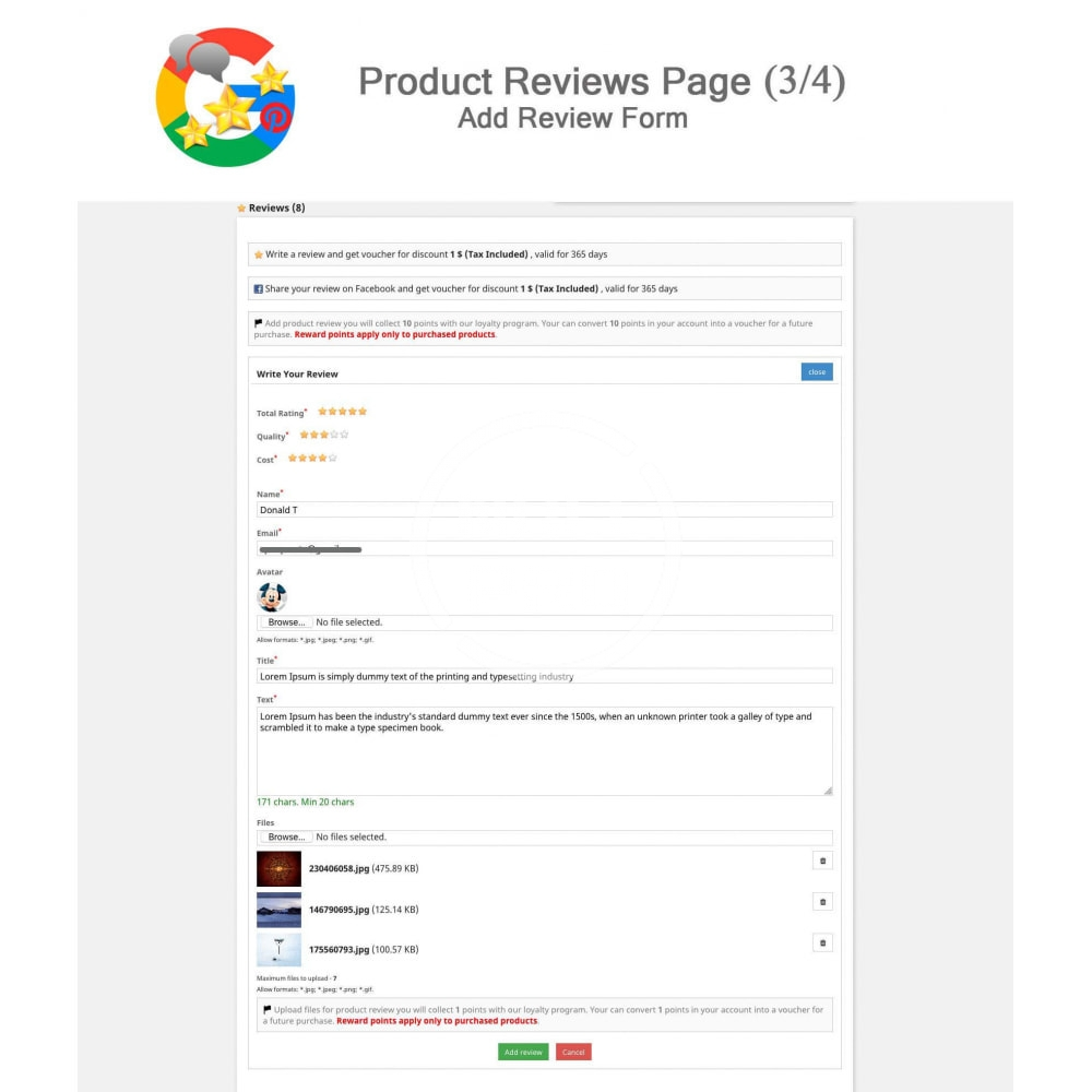 Module include Product Reviews, Store Reviews, Loyalty Program, User profile and Google Rich Snippets. Best "Conversion rates" module on prestashop awards 2019!