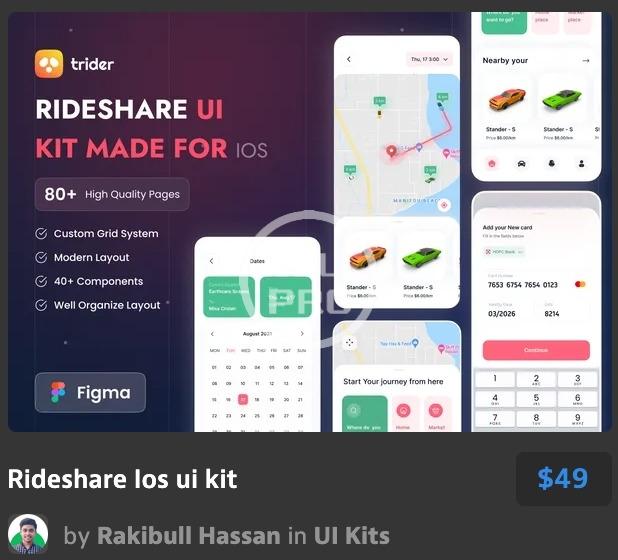 This UI Kit features a renting flow. The first screen shows a map with nearby cars and cards with available types of vehicles. Ride details - time, distance, price - are shown on the second screen.