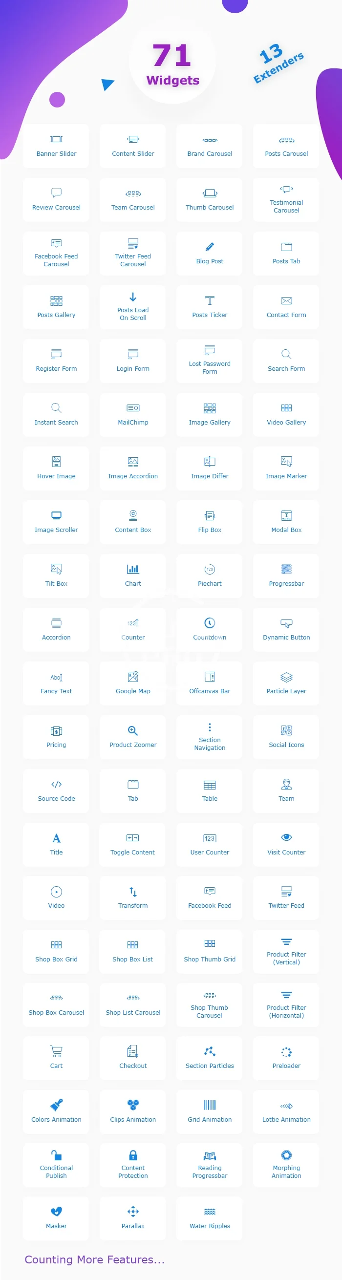 It has layout pack or library pack, banner or hero or text slider, brand carousel, review carousel, team carousel, thumb carousel, interactive testimonial carousel, posts or blogs carousel, posts tab, posts gallery, posts load on scroll, posts load more button, posts grid, posts list, posts thumb, posts ticker, forms (contact form, register form or sign up form, login form or sign in form, lost password form or password reset form, mailchimp, search form, instant search or AJAX search form or live search form), advanced charts (bar chart, doughnut chart, line chart, pie chart, polar area chart & radar chart), image hover effect, image accordion, video gallery, portfolio or image gallery, image comparison or differ, image marker or hotspot, image scroller, dynamic button, advanced tab with virtual tour and nested tab capability, source code highlighter, tilt box, icon box or content box, modal or popup box, flip box, pricing, advanced accordion with nested accordion capability, facebook feed, twitter feed, content protection, conditional publish, particles, parallax, preloader, water ripples, masker (you can masking any content of the widget as like as image mask), clips or image animation, colors or gradient animation, morphing animation, lottie animation and much more