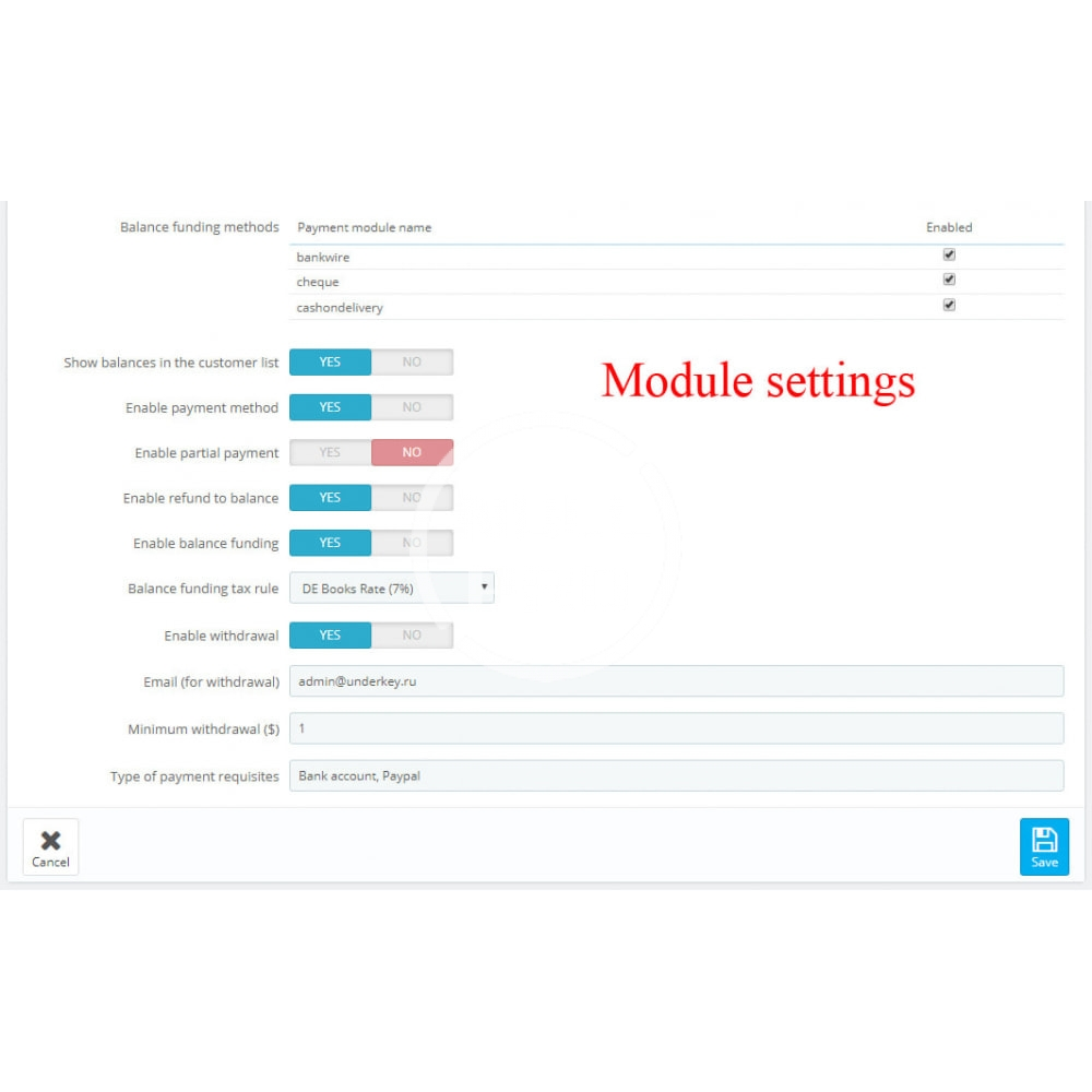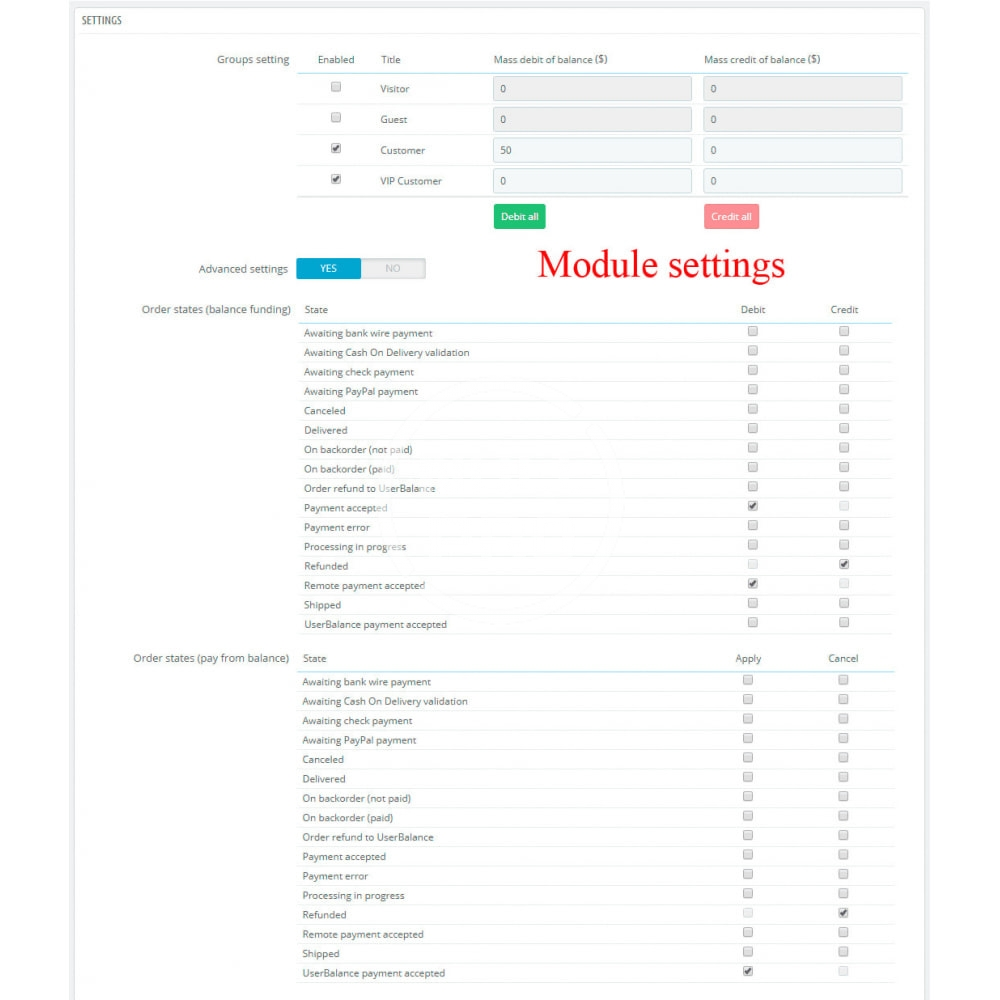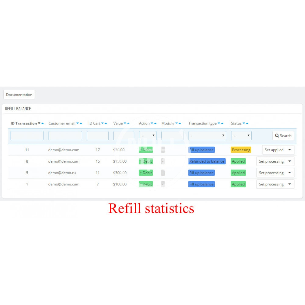 The module offers a user-friendly functionality of the internal balance, which can be refilled in advance by any integrated payment method in the store and it is possible to pay instantly with it all spending in the store. The internal balance also can be charged by partner bonus and royalties (requires installation of appropriate modules).
