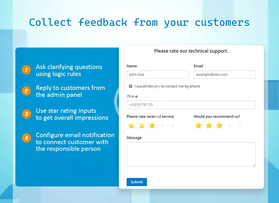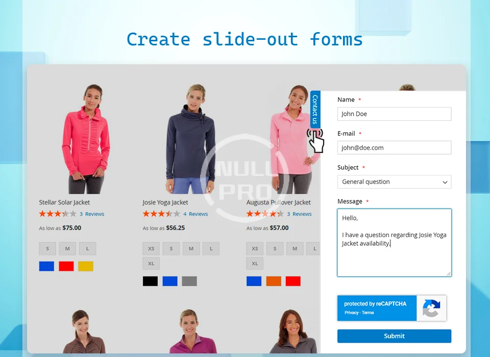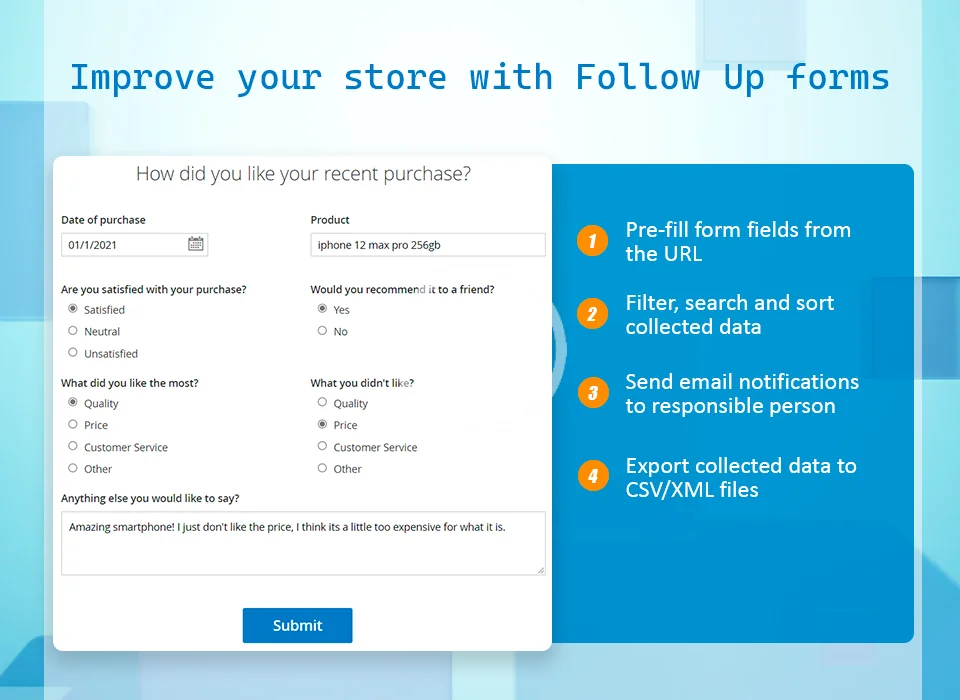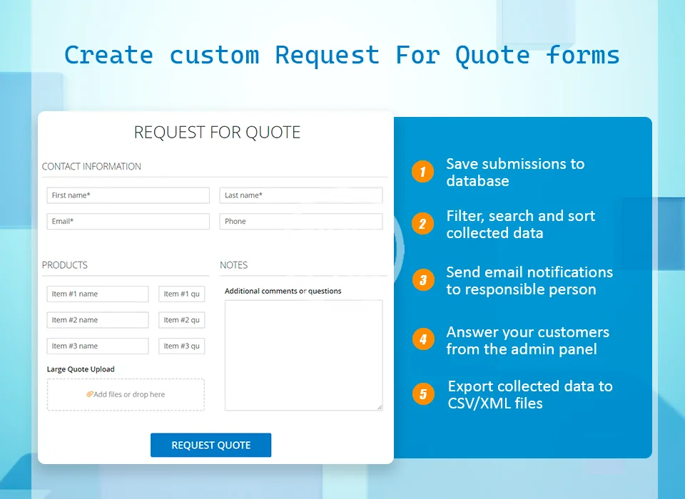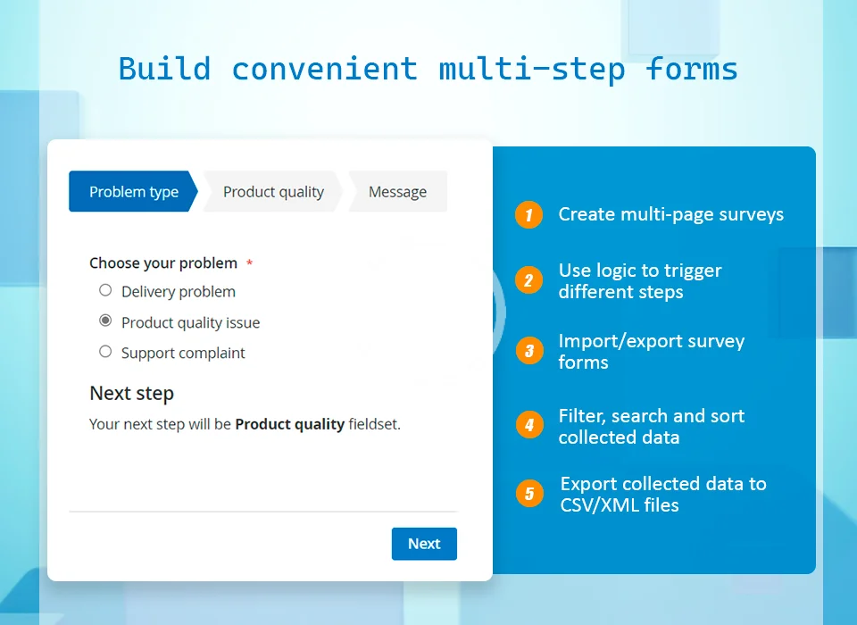 Easily add surveys, questionnaires, multi-page custom forms, requests for quote, return merchant authorization, testimonials or just a simple contact form to your Magento 2 store.
